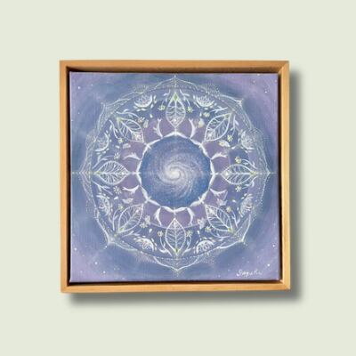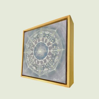 Mandala of the universeは、宇宙の神秘を表現した美しいアート作品です。20センチ×20センチの正方形キャンバスに、天然木の額が付いており、一筆一筆丁寧に描き上げた世界にひとつだけの原画です。5センチの奥行きがあるため、自立して飾ることができ、壁掛けが難しい場所でも気軽にアートを楽しむことができます。