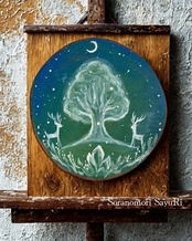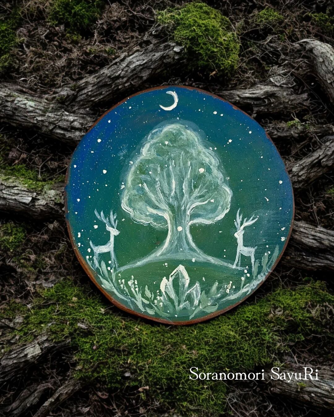『Crystal Forest〜三日月と鹿』は、幻想的な夜の森をテーマにした独特なアート作品です。切り株に、精巧に描かれた三日月と鹿のシルエットが印象的。